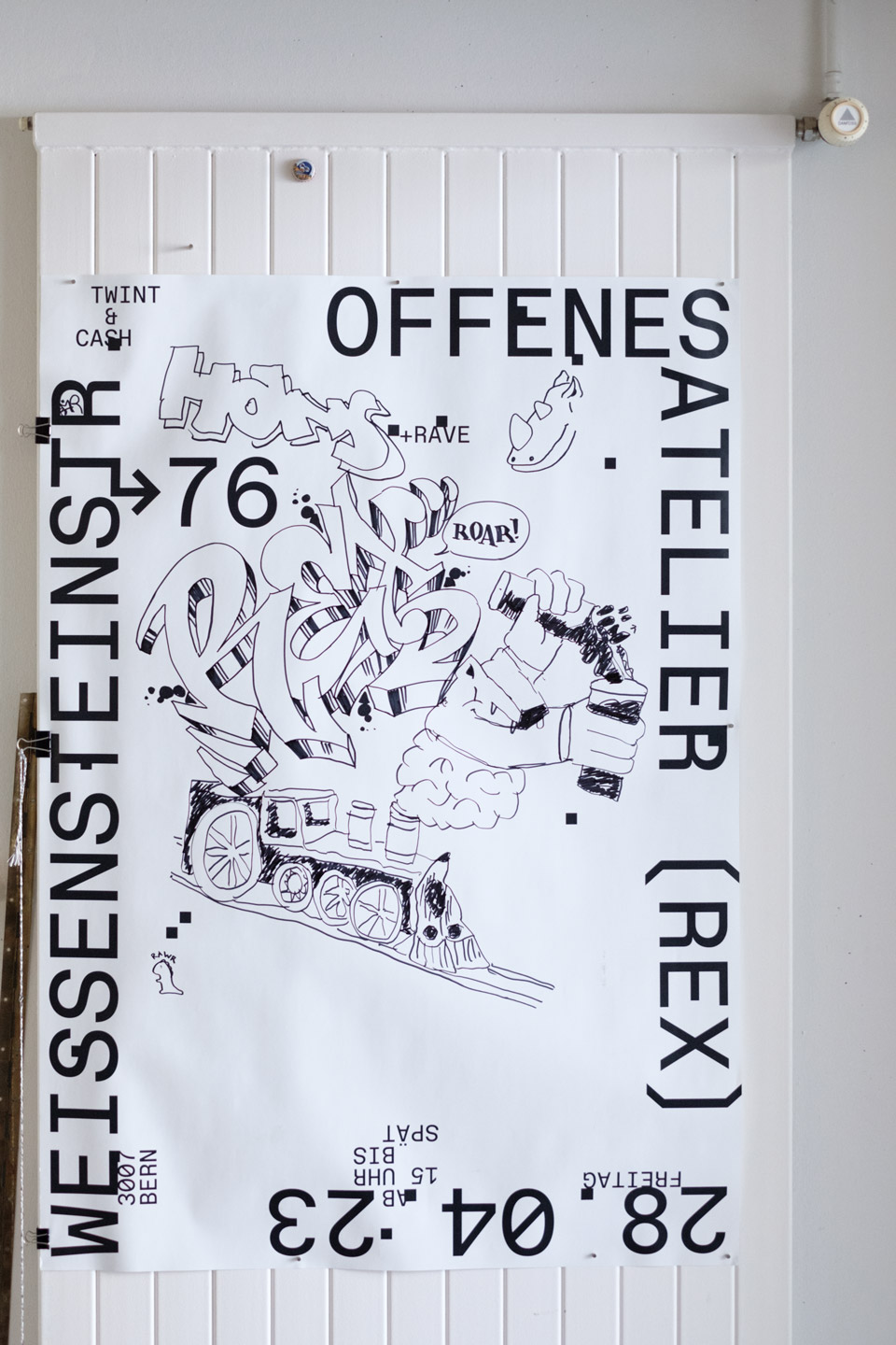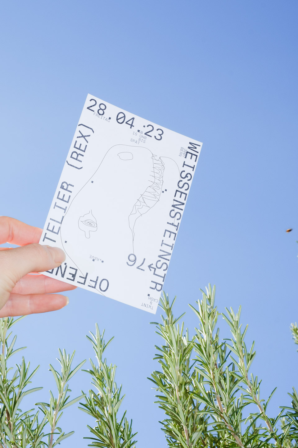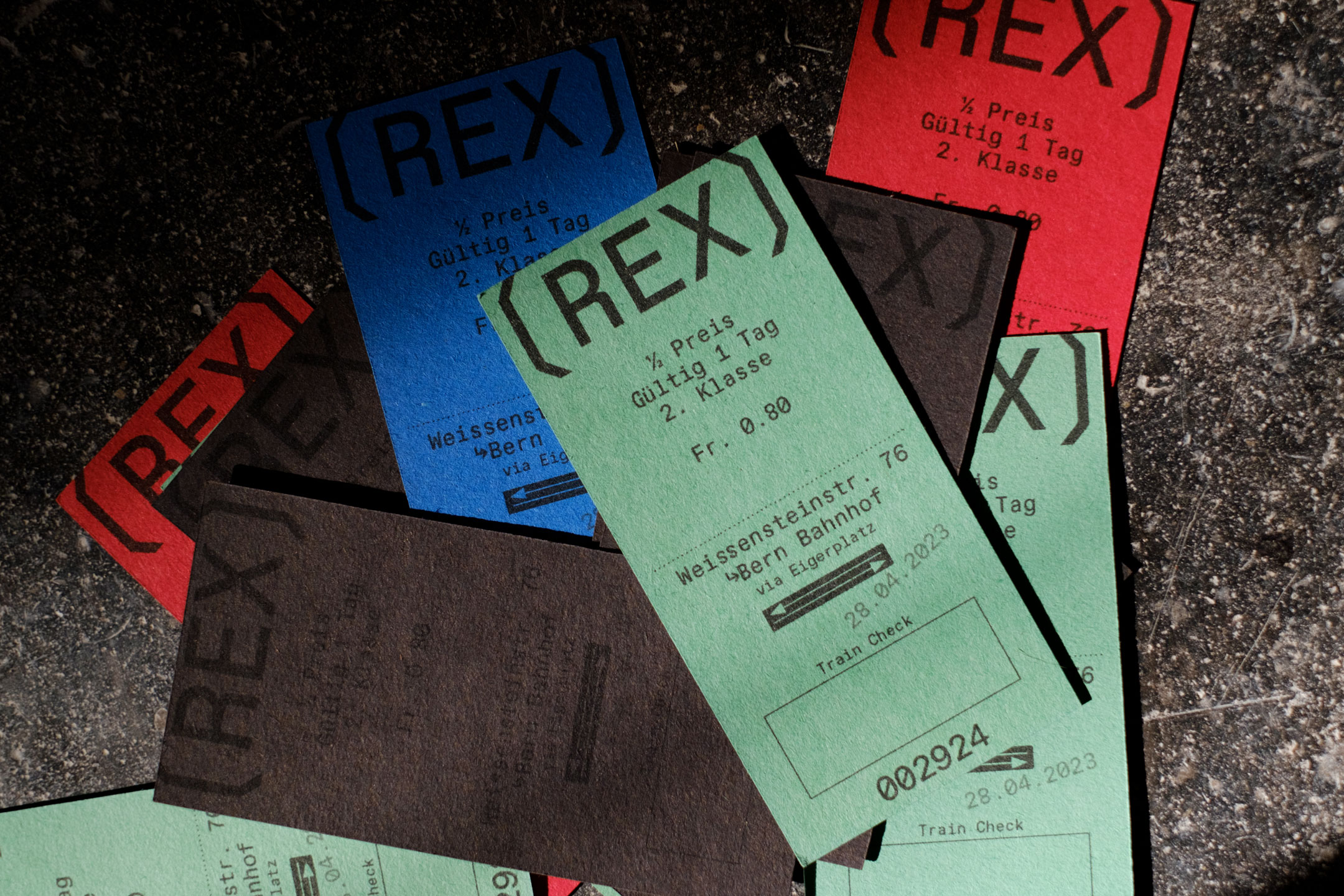 REX steh für Regionalexpress. Die drei Buchstaben, eingefasst mit Klammern, erinnern als Bild an einen Zugwaggon. Für das erste Fest wurden Informationen auf dem Flyer & Plakat am Rand platziert, damit so Weissraum für gestalterische & serielle Vielfältigkeit entstand, welcher durch Ateliermenschen gestaltet werden konnte.
