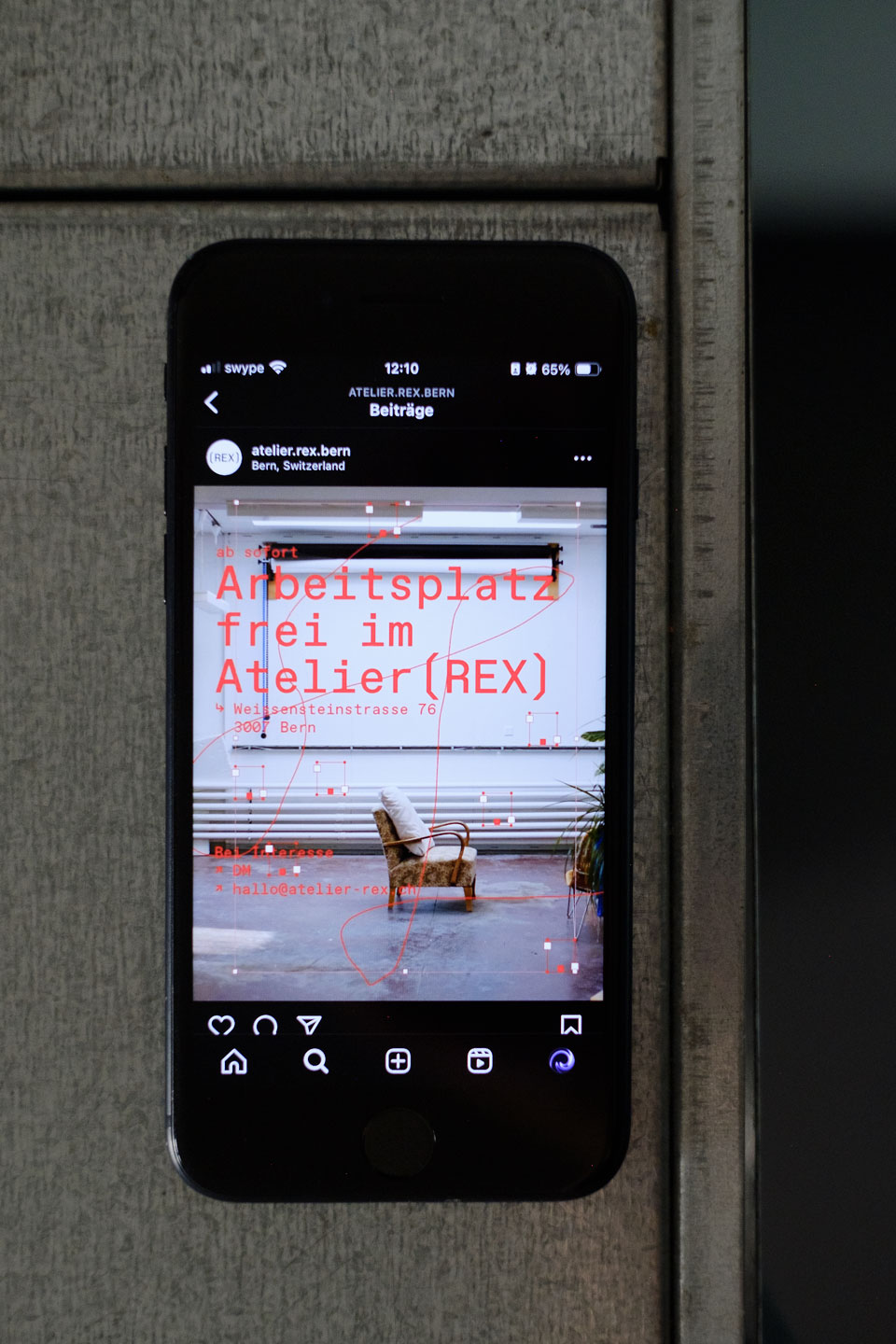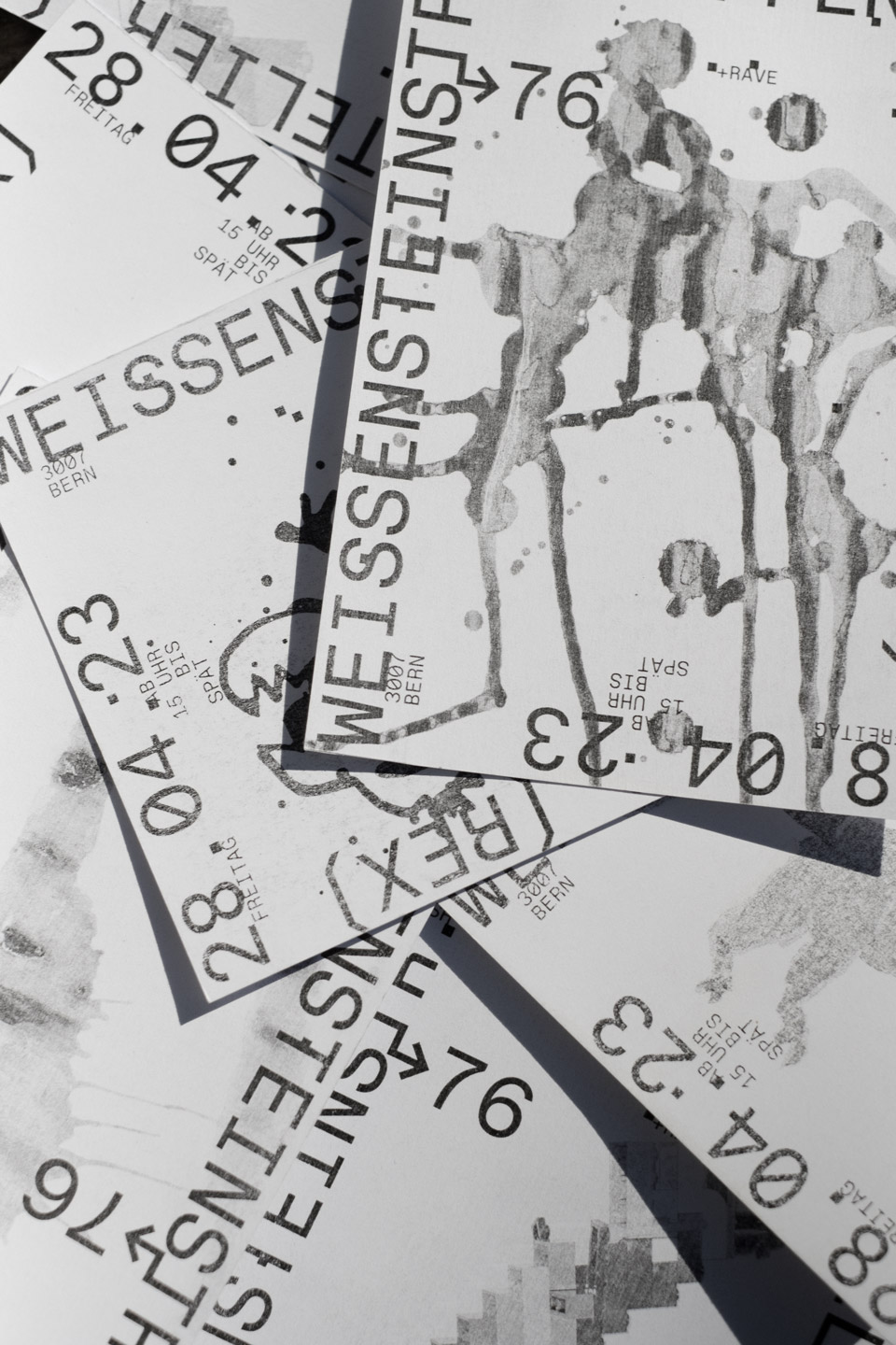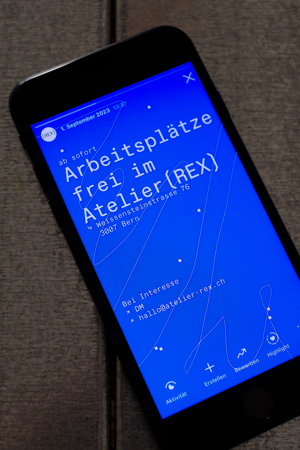 REX steh für Regionalexpress. Die drei Buchstaben, eingefasst mit Klammern, erinnern als Bild an einen Zugwaggon. Für das erste Fest wurden Informationen auf dem Flyer & Plakat am Rand platziert, damit so Weissraum für gestalterische & serielle Vielfältigkeit entstand, welcher durch Ateliermenschen gestaltet werden konnte.
