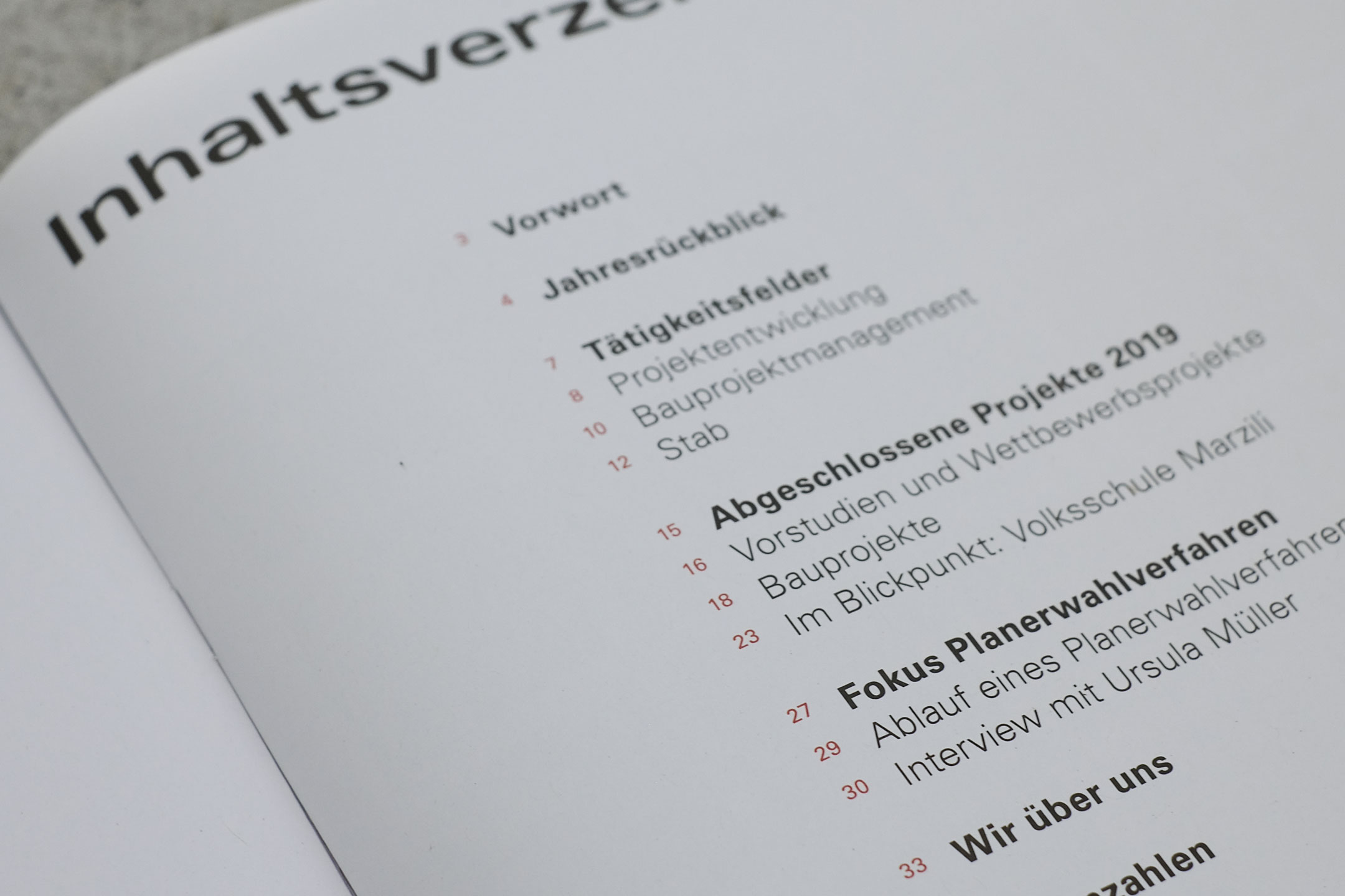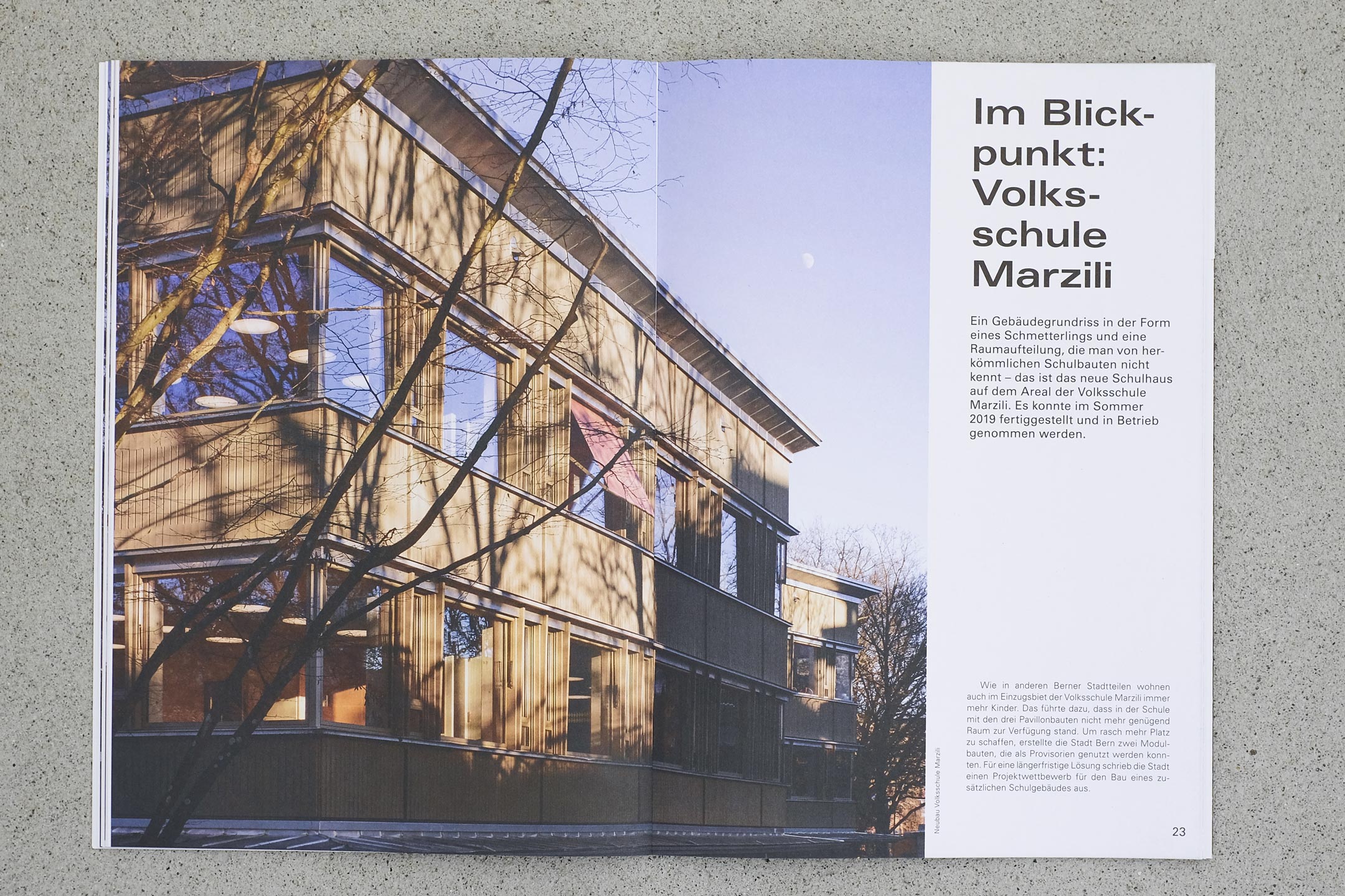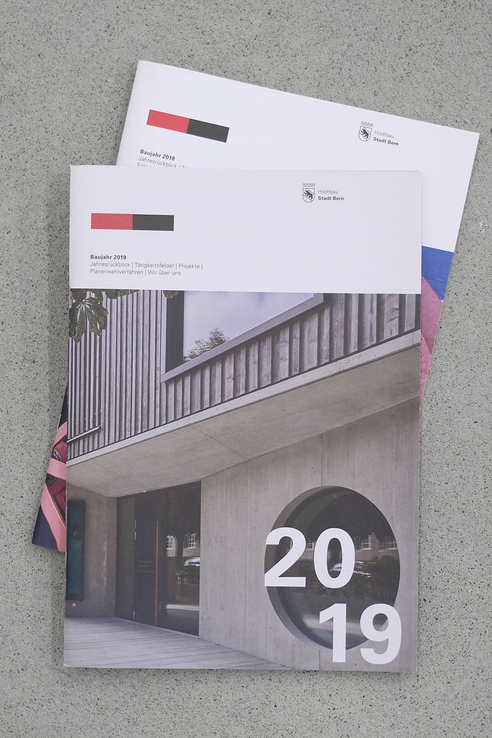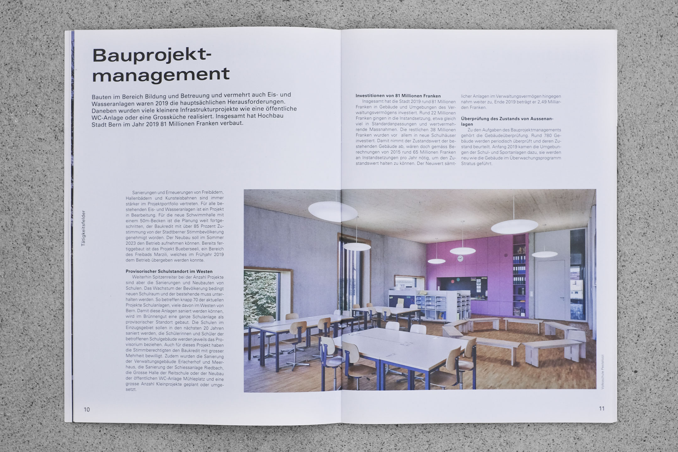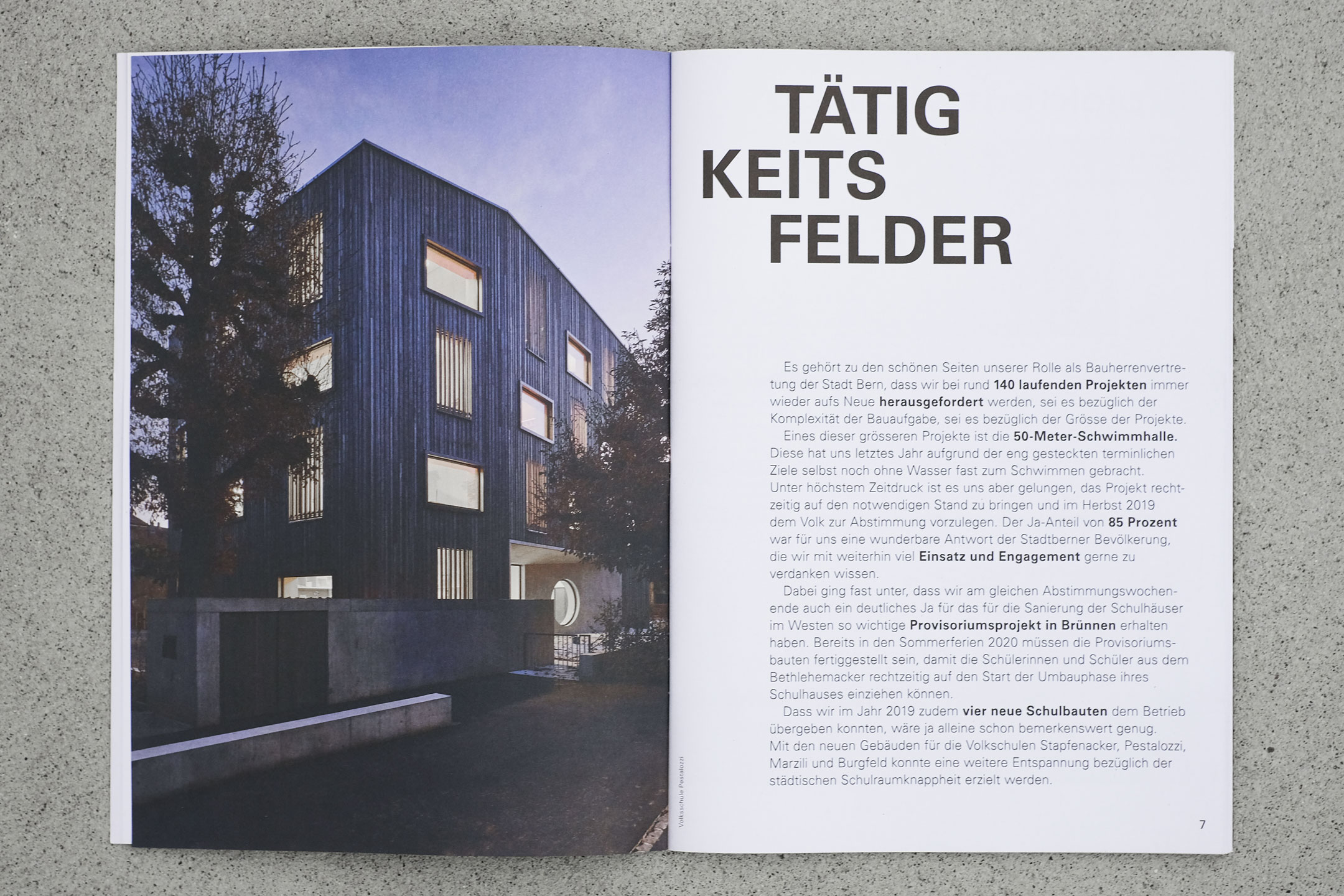 Mit grosszügigen Bildern und einer mutigen Typografie kommt der Jahresbericht von Hochbau Stadt Bern (HSB) seit 2019 leichtfüssig daher.